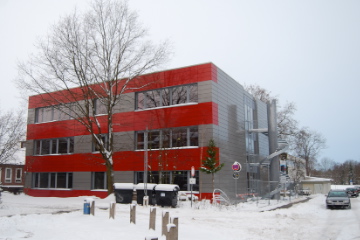 Großbaustelle Kubus hieß es seit April 2009. Zwar war der Kubus das jüngste Bauwerk der Berufsbildenden Schulen in der Amtsfreiheit, aber er war eine "Energieschleuder" und marode. Die Bauarbeiten sollten nur einige Monate dauern, aber erst zum Jahreswechsel 2009/2010 konnte der Kubus wieder für Unterrichtszwecke genutzt werden, fertig war er jedoch noch nicht. Das nebenstehende Bild zeigt den neuen Kubus Anfang Januar 2010. Witterungsbedingt fand an diesem Tag kein Unterricht statt. Die im Bild rechts am Gebäude sichtbare Fluchttreppe ist noch nicht fertig. Die weiteren Bauarbeiten ruhen, es ist tiefer Winter!