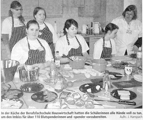 Die Schülerinnen der zweijährigen Berufsfachschule Hauswirtschaft hatten die Blutspendeaktion im Rahmen des Unterrichts als Projekt vorbereitet. Dazu gehörte die Werbung im Vorfeld mit Flyern, Plakaten und Mundpropaganda in den Klassen, das Organisieren in der Schule, das Herrichten der Räume, das Planen des Essens, die Einkäufe, die Zubereitung des Essens und die Versorgung und Betreuung der Blutspender während der Aktion. Unterstützt wurden die Schüler von ihren Lehrkräften Petra Haacke, Magdalene Henning, Marita Lessmann-Rieck und Alke Mehrtens.