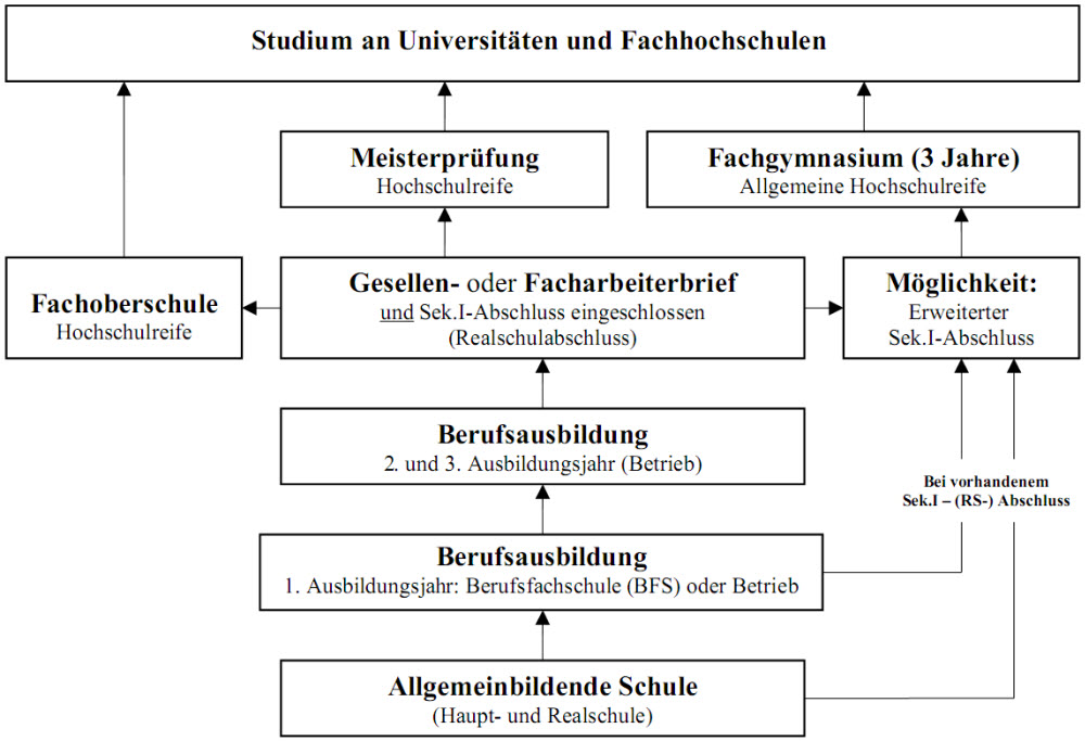 Mit Abschluss einer erfolgreichen Facharbeiter- oder Gesellprüfung wird in der Regel der Sekundarabschluss I (Realschule) vergeben oder bei Teilnahme am Englischunterricht und entsprechenden Noten auch der erweiterte Sekundarabschluss I. Häufig erleben die BBS-Lehrkräfte, dass Schülerinnen und Schüler, die den Weg einer Berufsausbildung gegangen sind, diesen wie einen Neustart erfahren und mit großer Lernmotivation und Erfolg wieder anfangen zu lernen.