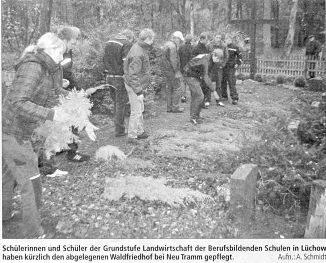 as Neu Tramm. Schülerinnen und Schüler der Berufsbildenden Schulen in Lüchow haben kürzlich auf dem Waldfriedhof bei Neu Tramm die Gräber von sechs russischen Kriegsgefangenen gepflegt. Unter Leitung ihres Lehrers Heinz Riebau hatten 13 Schülerinnen und Schüler der Grundstufe, sprich des ersten Lehrjahres Landwirtschaft, die Gräber mit Grün geschmückt und die Anlage mit Harken auf Vordermann gebracht. Im Unterricht war dieser leichte Arbeitseinsatz geschichtlich vorbereitet worden, und zwar mit der Behandlung des deutschen Überfalls auf Polen, berichtete Riebau. Der Pflegeeinsatz sei im Zusammenhang mit der Patenschaft zu sehen, die die Berufsbildenden Schulen auf Vermittlung des Volksbundes Deutsche Kriegsgräberfürsorge (VDK) mit der Samtgemeinde Elbtalaue abgeschlossen hatte.
