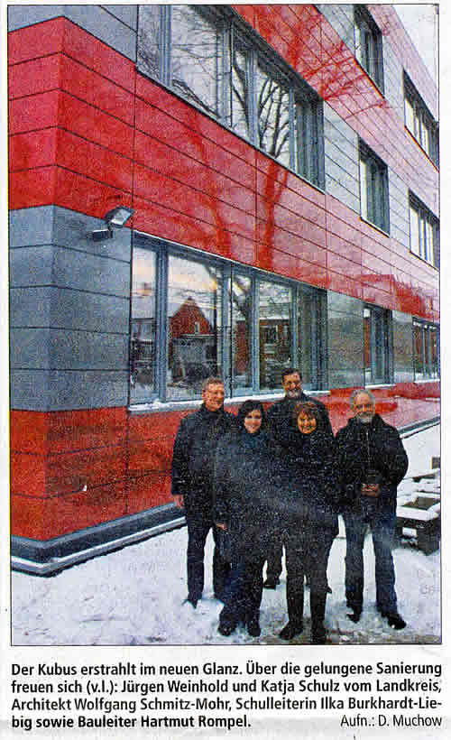 „Das Besondere an dieser Sanierung war der Umbau während des laufenden Betriebes", betont Architekt Wolfgang Schmitz-Mohr. Denn bereits im August, vier Monate nach Sanierungsbeginn, konnten die ersten Klassen der Berufsbildenden Schulen wieder im Kubus unterrichtet werden. Die Übrigen blieben auf andere Schulen in Lüchow verteilt und kehrten schrittweise an den Standort an der Amtsfreiheit zurück.