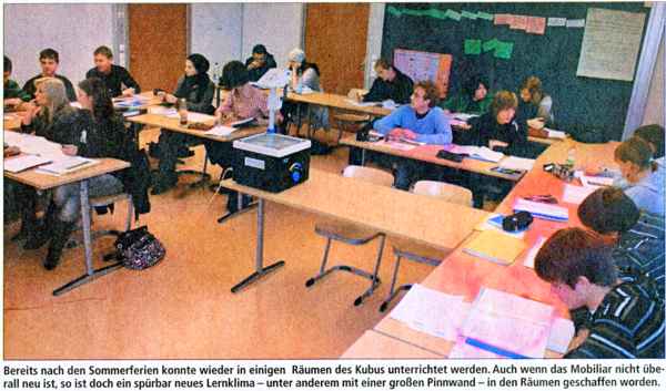 „Schüler und Lehrer haben das alles gerne in Kauf genommen", weiß Schulleiterin llka Burkhardt-Liebig. Denn: „Das Lernklima ist durch den Umbau deutlich besser geworden." Auf drei Etagen wird im Kubus unterrichtet. Der mittlere Bereich ist für die Berufe rund ums Kfz reserviert, in der dritten Etage befindet sich ein Sprachenraum. Ansonsten werden die Klassen nach Größe und Bedarf auf die Räume verteilt. Diese sind nun mit einer neuen großen Pinnwand sowie Whiteboards ausgestattet. Kreide gehört somit der Vergangenheit an. In der Zukunft könnten die Tafeln statt mit Stiften auch elektronisch genutzt werden, doch dafür reichten die Mittel noch nicht aus, informierte die Schulleiterin. Auch wenn in den Räumen größtenteils altes Mobiliar steht, ist der Unterschied deutlich spürbar. Alle Räume wirken hell und warm. Vor allem freut sich llka Burkhardt-Liebig darüber, dass zwischen" Jeweils zwei Klassenräumen neue Gruppenarbeitsräume geschaffen werden konnten. Das sind jeweils zwei neue Räume pro Etage. In diesen Zimmern waren zuvor Lehrmittel verstaut worden. Nun herrscht dort ein angenehmes Arbeitsambiente. „Das sind deutliche Veränderungen. Von allen Schülern erhalte ich nur positives Feedback", so die Schulleiterin. Auch in den Fluren gab es Neuerungen: Dort sind die Einbauschränke verschwunden. „Damit haben wir mehr Raum und Freundlichkeit gewonnen", so Burkhardt-Liebig.