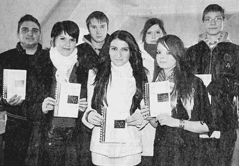 Stolz auf ihr Büchlein sind (von links): Elvis Krasniqi, Xenia Zaytseva, Michael Sterl, Janin Heinrich, Vanessa Klonowski, Maria-Monique Schwenke und Stefan Heidtke.