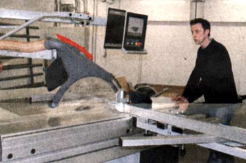 Fachpraxislehrer Olaf Papendieck demonstriert das Herzstück der Werkstatt: eine Säge der Firma Altenburg.