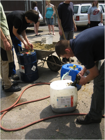 Die Schülerinnen und Schüler der „Nawaro-Klasse“ (Technische Assistenten für die Verarbeitung nachwachsender Rohstoffe) haben im Juni ein Projekt zur Herstellung von Biogas mit Ihrem Fachlehrer Michael Jahrens gestartet. Aufgabe war die Erzeugung von Biogas mit einfachen Mitteln. Es sollten Dinge genutzt werden, die die einzelnen Projektgruppen ohne Kosten nutzen konnten. Damit wurden verschiedene Behältnisse zum Projektstart herangeschafft (siehe Bild). Zur Verfügung standen neben den Behältern auch unterschiedliche Biomasse: Grasschnitt, Gemüse, Maissilage sogar Garsubstrat wurde aus einer Biogasanlage mitgebracht. Nachdem die Schüler die Behälter technisch konfiguriert hatten wurden Sie zunächst in einem Treppenhaus deponiert, um später auf das Werkstattdach umzuziehen (mehr Sonne und damit Wärme). Nach einigen Tagen wurde regelmäßig der Erfolg der Maßnahmen kontrolliert und dokumentiert. Insgesamt dauerte der Versuch etwa drei Wochen, leider mit mäßigem Erfolg. Aber das Ziel des Projektes wurde dennoch erreicht: Es konnte bei einer Gruppe Methangas nachgewiesen werden. Vermutlich wurde bei allen Versuchen Methangas erzeugt. Die Auffangbehältnisse für das Gas sind bei jeder Kontrolle zerstört gewesen, d.h. Gas war entstanden aber so viel, das die Auffangballons geplatzt sind – in der Folge kam Luft an das Gärsubstrat, was dieses zerstörte und damit kam der Biogasprozess zum erliegen.