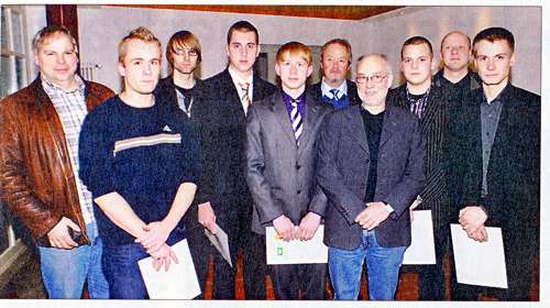 Die frisch gebackenen Gesellen aus Lüchow-Dannenberg mit Fachlehrern und Obermeister (von links): Michael Jahrens (Fachlehrer), Fabian Schmuck, Hendrik Scholz, Tobias Krüger, Nils Bense, Dirk-Walter Amtsfeld (Obermeister), Jürgen Stolp (Fachlehrer), Maximilian Jung, Sascha Künzel (Fachlehrer) und Torben Schmidtke aus Lüchow-Dannenberg.
