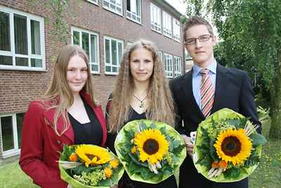 Bild: Legten besonders gute Prüfungen ab (von links): Maria Lüdemann wurde mit dem Preis der Nicolas-Born-Stiftung für die beste Deutsch-Klausur (zwölf Punkte) ausgezeichnet, Katharina von der Gabelentz ist die Jahrgangsbeste des Beruflichen Gymnasiums Technik (Notendurchschnitt 1,5), Dominik Breese Jahrgangsbester des Beruflichen Gymnasiums Wirtschaft (1,8).