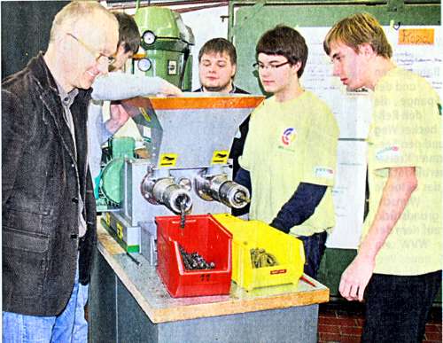 Eine Ölmühle hatten die Auszubildenden zum Technischen Assistent NawaRo (Nachwachsende Rohstoffe), hier mit Schulleiter Stefan Eilts (links), aufgebaut.