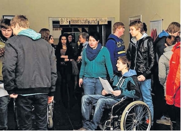 Die Schüler aus den allgemeinbildenden Schulen beginnen den Rollstuhlparcours der Klasse BFS-Pflegeassistenz II.