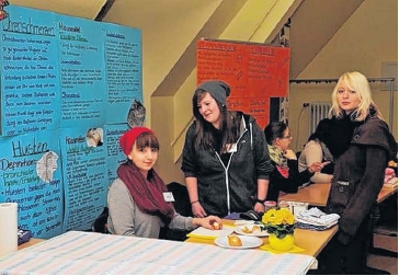 Schülerinnen der BFS-Persönliche Assistenz (links) im Gespräch mit einer Besucherin.