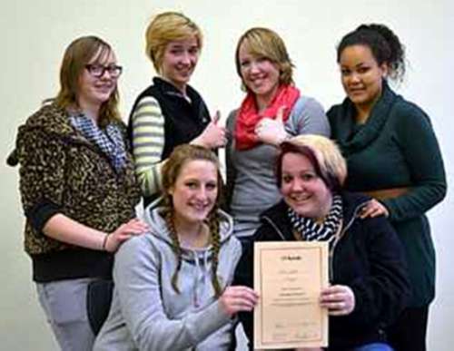 Schülerinnen der Berufsfachschule Hauswirtschaft und Pflege wussten in der "Kunst der freien Rede" zu überzeugen (hinten von links): Jasmin Thiermann, Laura Hamann, Lina Fürch und Tiziana Dippe kamen im Vortragswettbewerb auf einen gemeinsamen zweiten Platz, Lana Rieck und Janine Zaade (vorne von links) glänzten mit Platz eins.